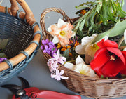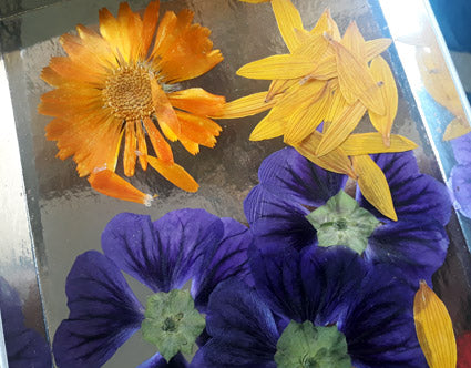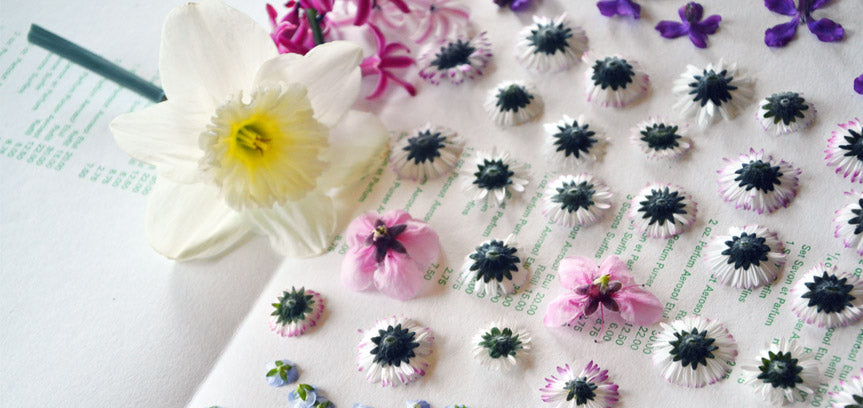 Des fleurs fraîches provenant de mes achats, ou bien de mes cueillettes, posées une à une sous presse pendant quelques semaines, avant de pouvoir contempler le résultat et alors composer de beaux visuels grâce aux fleurs...